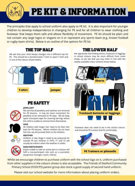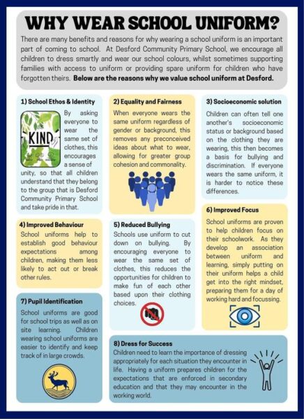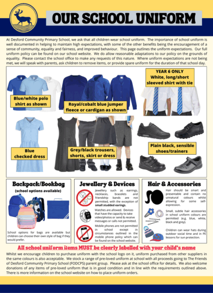 At Desford Community Primary School, we ask that all children wear school uniform. The importance of school uniform is well documented with some of the benefits being:
